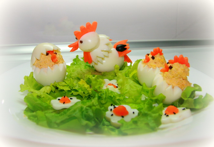 А еще отличная идея – это купить в магазине маленькие ПЕРЕПЕЛИНЫЕ ЯЙЦА. Их размер как раз подойдет для малышей-цыплят. Надо покрасить перепелиные скорлупки в желтый цвет. И посадить эти маленькие яйца внутрь больших куриных скорлупок. Получится куриная семья – петух, курочка и малыши только что вылупившиеся из яичной скорлупы.