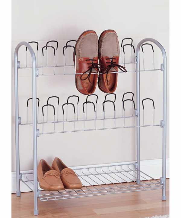 Если обуви в прихожей скапливается много, можно вместо такого держателя купить обычную этажерку с решетчатой нижней полкой. Цены на них начинаются от 1000 р.