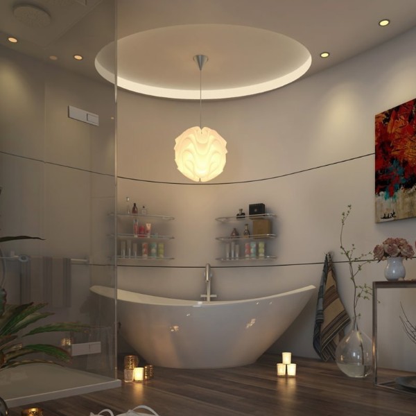 Если у вас есть место, выберите декоративный светильник для потолочного светильника. Небольшие люстры и полуутопленные потолочные светильники могут создать расслабленное и романтическое настроение, когда другие светильники в ванной комнате выключены.