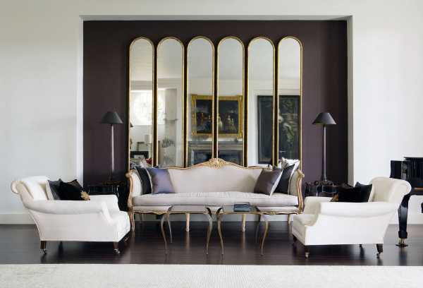 Белые стены можно украсить разными по форме и размеру зеркалами, получившийся “ряд окон” оживляет комнату и делает ее намного светлее