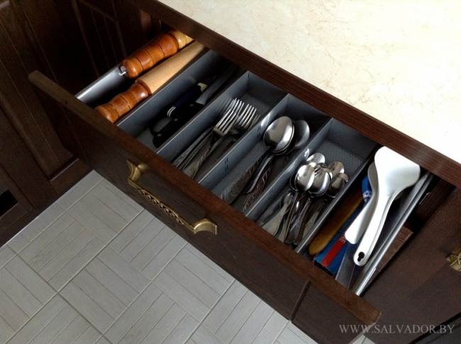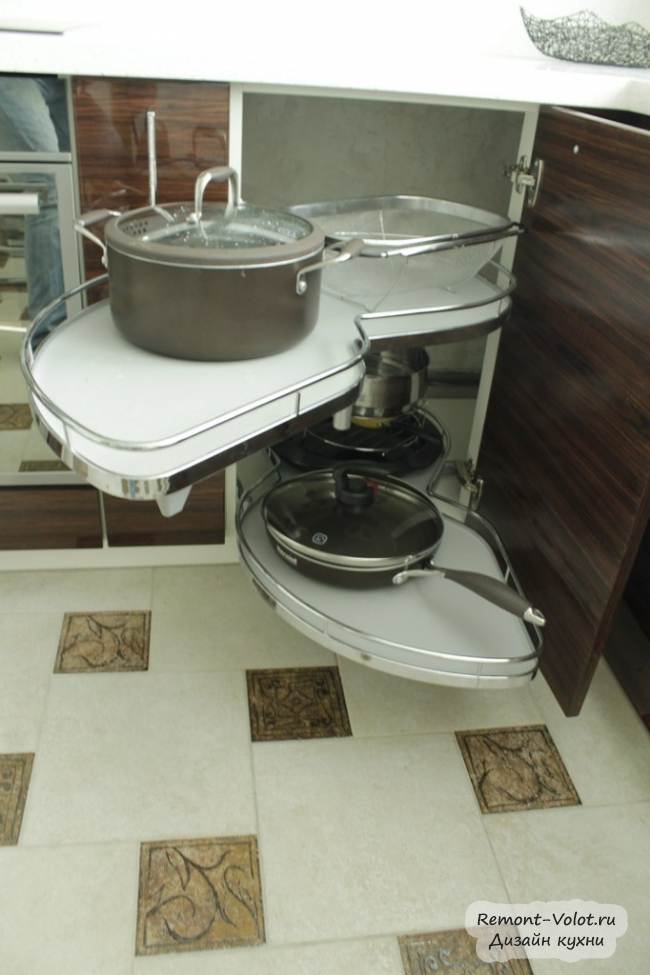 При выборе комплектации кухни не стоит экономить на наполнении нижних шкафов кухни, так как эти шкафы самые вместительные и наиболее часто используемые. Поэтому стоит выбрать выдвижные ящики с доводчиками полного выдвижения. Не стоит забывать о корзинах (карго) для организации хранения бакалеи, бутылок и других продуктов, а также о специальных вставках для столовых приборов.