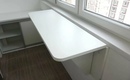 Для такой столешницы не требуется наличия трансформирующих механизмов и подгонки по высоте. Пространство под столом используется для размещения тумб и полок для хранения. Кроме того, они выступают также в роли дополнительной опоры.