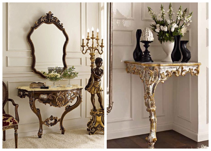 Этот интересный вид мебели является потомком консоли. Изящные узкие столики появились в эпоху Ренессанса. Изделия имели роскошный вид. Они украшались резными узорами, фигурными ножками, позолотой. Обычно на них ставили подсвечники, дорогие вазы, часы.