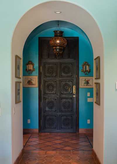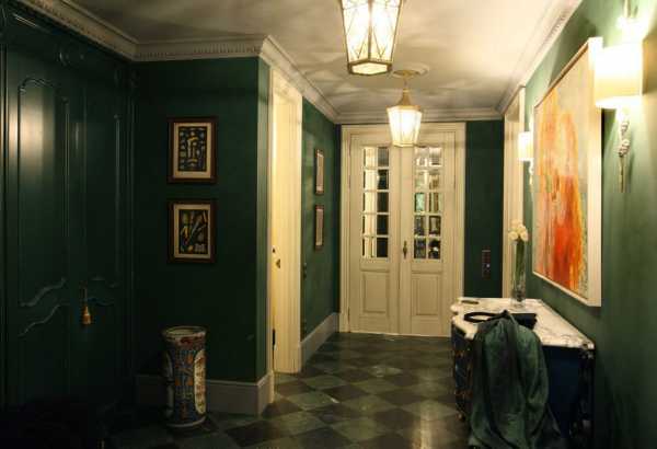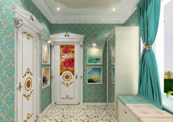 В прихожей бирюза может стать базовым тоном для стен, которые подчеркиваются вертикальными белыми полосами или колоннами, если речь идет о загородном доме. В качестве декора используют большие зеркала в массивных рамах, лепнину, резную мебель, живописные плафоны светильников и люстр, канделябры со свечами.