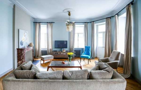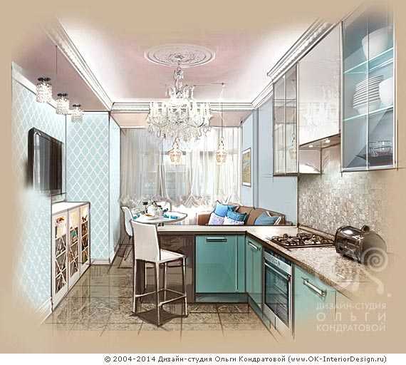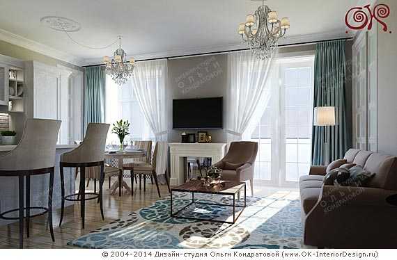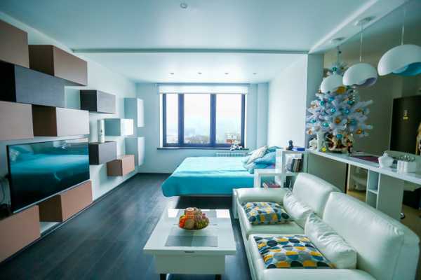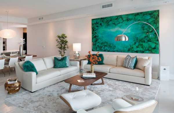 Для отделки бирюзовой гостиной небольшого размера стоит выбрать светло-бирюзовый оттенок, он не будет скрадывать пространство и смотрится элегантно. Для просторного помещения можно использовать более насыщенные и глубокие оттенки.