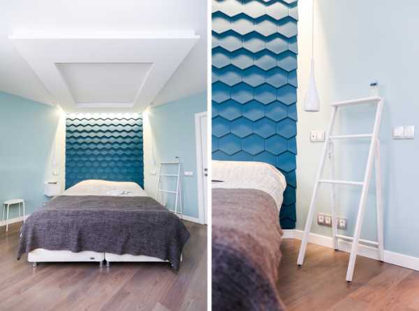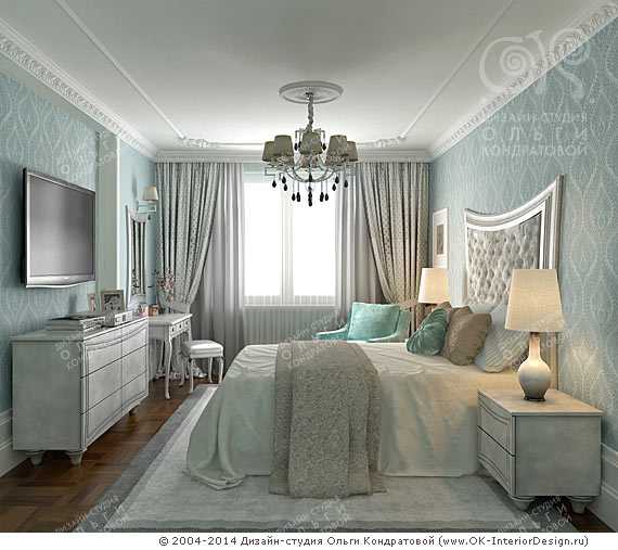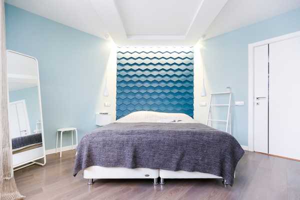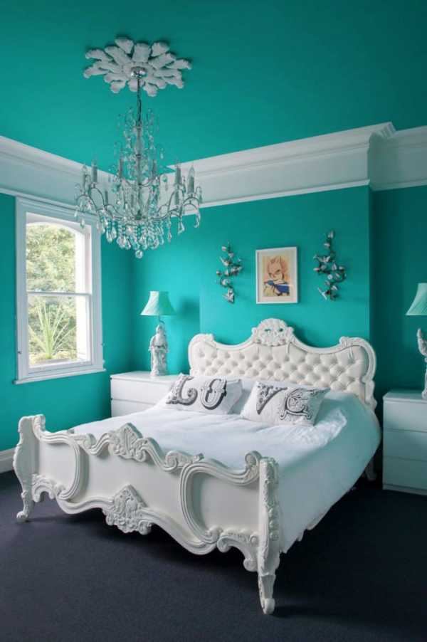 Для спальни лучше использовать светлые, спокойные оттенки бирюзового. Для отделки стен можно использовать обои с узором. Обои могут покрывать все стены или только одну, став главным украшением интерьера. Бирюзовая кровать и декоративные элементы гармонично смотрятся на светлом фоне стен.