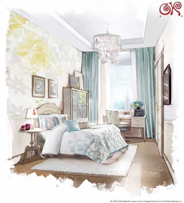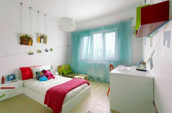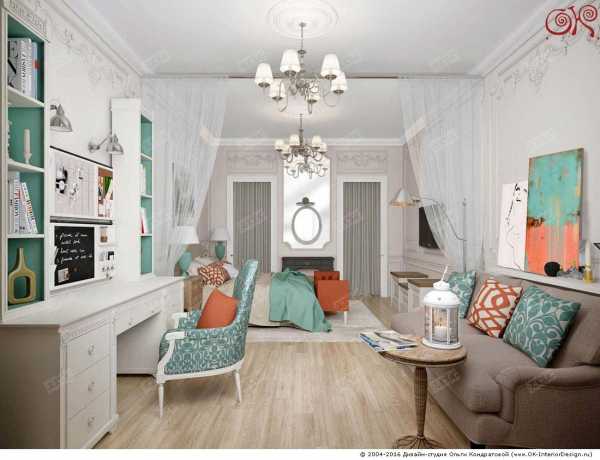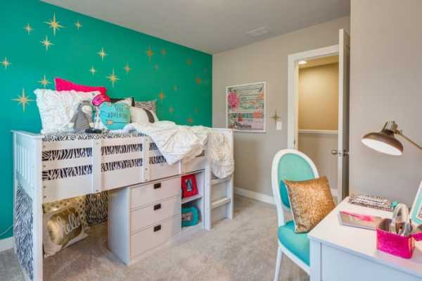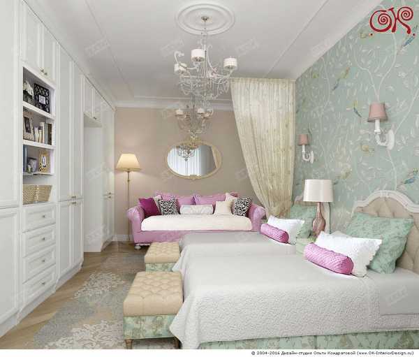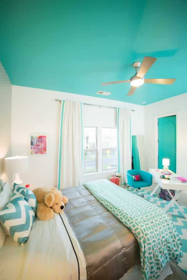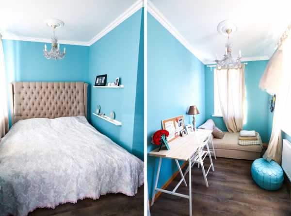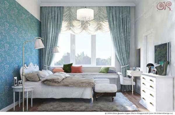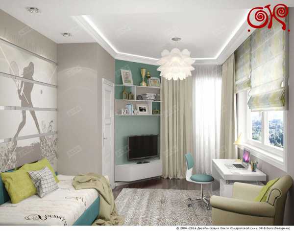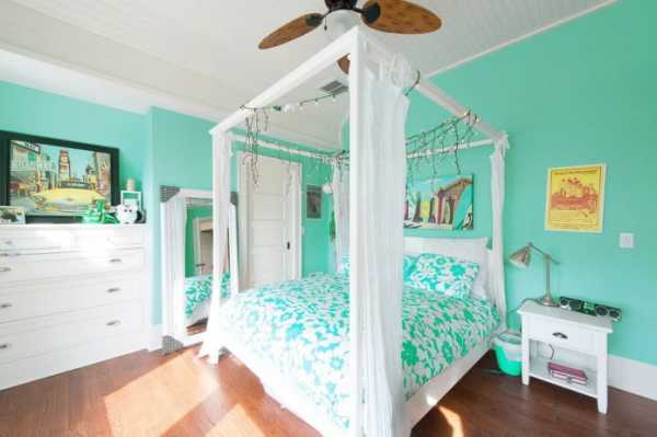 Бирюзовые стены подойдут для оформления комнаты во многих стилях. Обои светлого оттенка сделают комнату просторней. Одна из стен может быть отделана фотообоями, подобное оформление станет украшением интерьера.