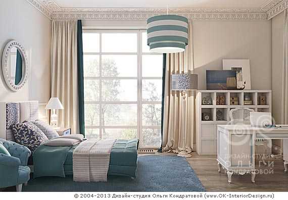 На фото интерьер спальни в морском стиле, отделка выполнена в нежно-бирюзовой гамме.