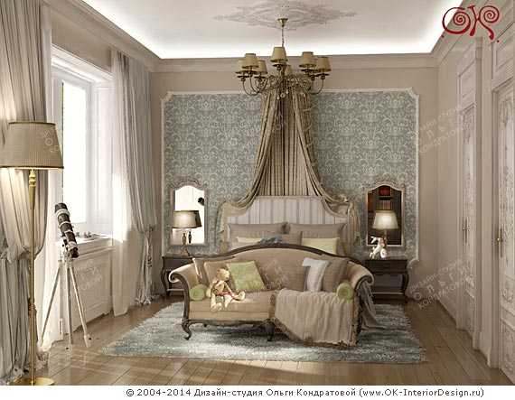 Для хранения вещей устанавливается шкаф в том же стиле, лучше, если он будет белого цвета с позолотой и гнутыми ножками. В качестве места для сидения применяется пуф или небольшой диванчик с позолоченными подлокотниками и дорогой обивкой.