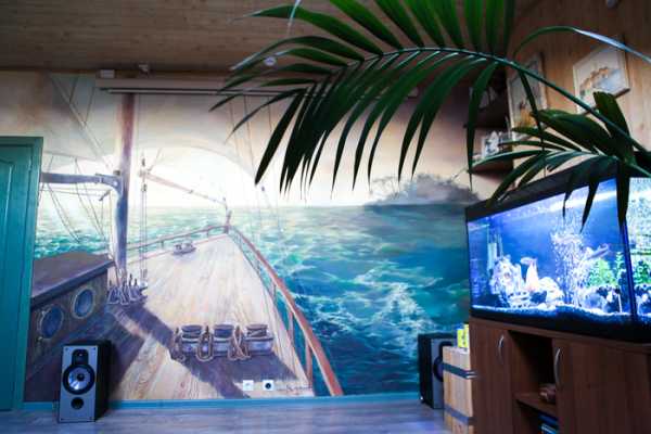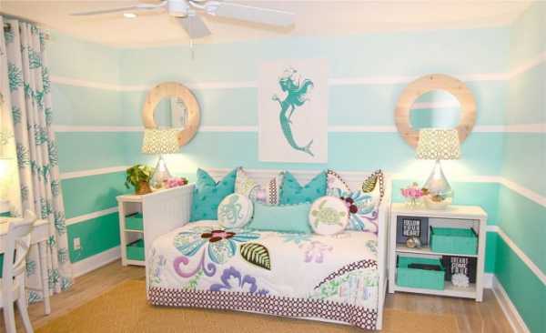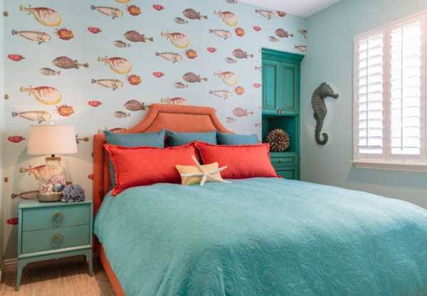 Бирюзовый цвет лучшее решение для оформления комнаты в морском стиле. Стены нежно-бирюзового цвета будут ассоциироваться с морским бризом и освежат интерьер. Отделка может быть в однотонная или с деталями морской тематики. В интерьере гармонично будет смотреться плетеная и светлая мебель.