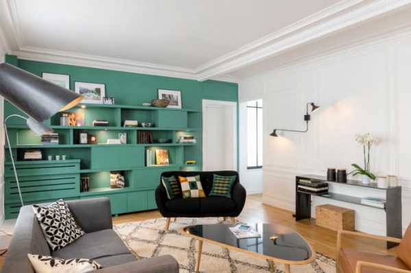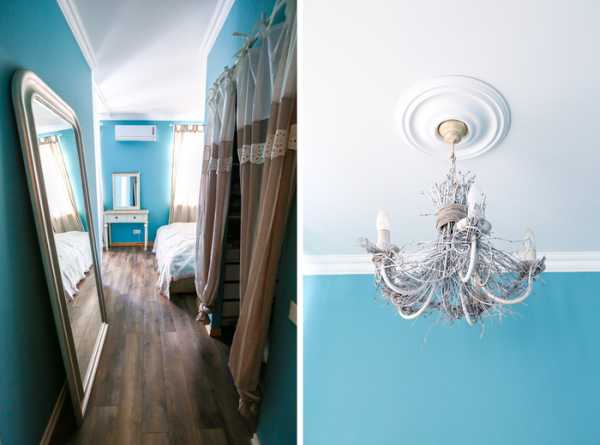 На фото одна из стен окрашена в бирюзовый цвет и оформлена молдингами.