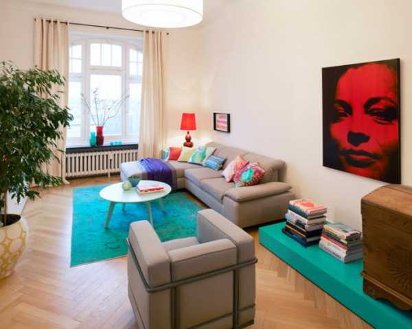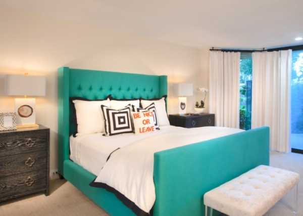 Для того чтобы спальня или гостиная выглядела жизнерадостно, выбирайте нейтральный фон и оживляйте его более богатыми цветами. Бирюза здесь придется очень кстати. Вполне убедительно будет смотреться светлый оттенок морской волны или глубокий темно-бирюзовый, если их применять с умом.