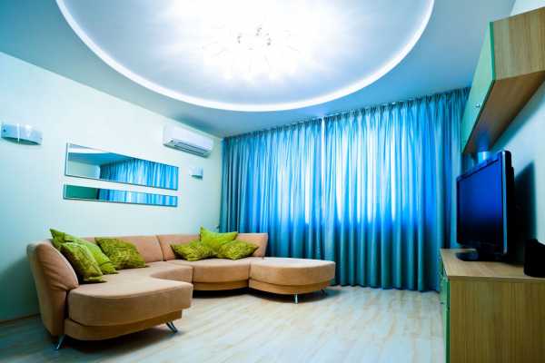 Цветной потолок необычная и стильная идея. Глянцевый натяжной потолок визуально увеличит пространство за счет зеркальной поверхности. Для классического интерьера используют матовый материал. В качестве освещения можно использовать точечные светильники или люстру необычной формы.