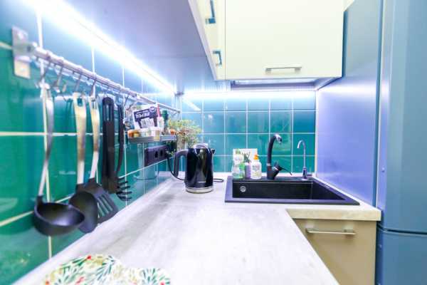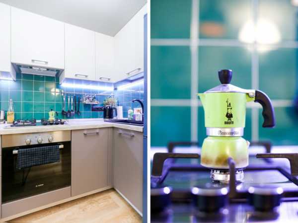 На фото компактная кухня с гарнитуром в бирюзовых тонах.