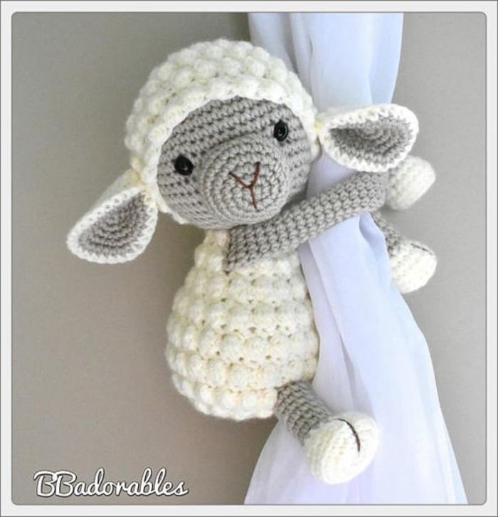 Игрушка должна как бы обнимать штору. Можно взять толстую веревку и на неё повесить много разнообразных мелких игрушек наподобие подвесок на браслетах, петли можно сделать, просто сделав их на веревке.
