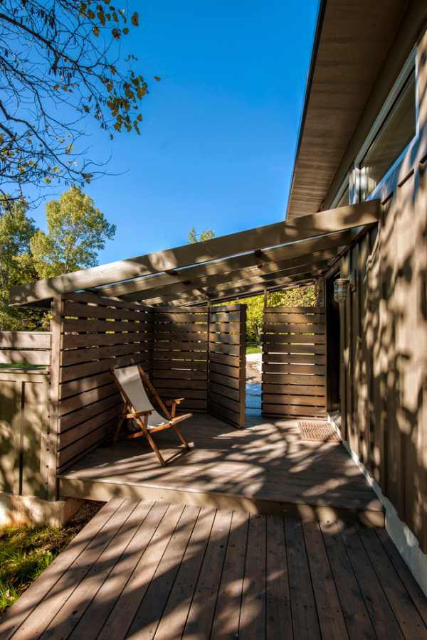 Передняя терраса была добавлена в процессе обустройства окружающей территории. Настил из кедрового дерева окрашен специальным покрытием, которое искусственно старит его.