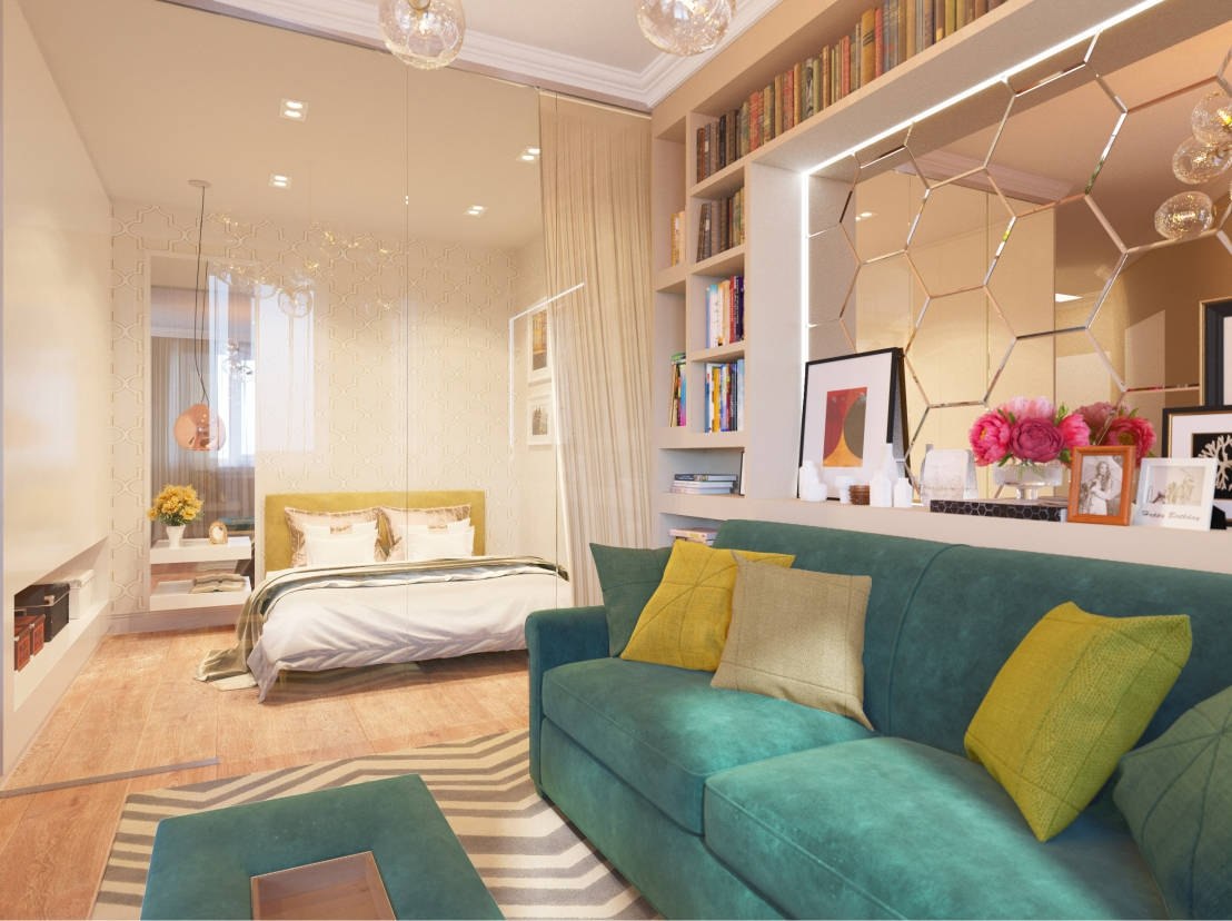 В современных однокомнатных квартирах достаточно места, чтобы разделить пространство на две зоны, не прибегая к различным ухищрениям. В малогабаритных гостиных тоже можно найти способ совместить их со спальней. Достоинства совмещения: