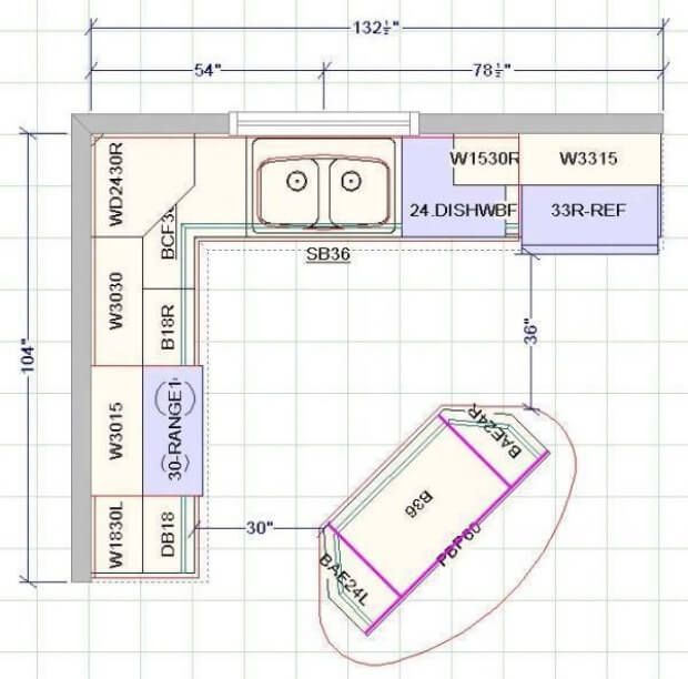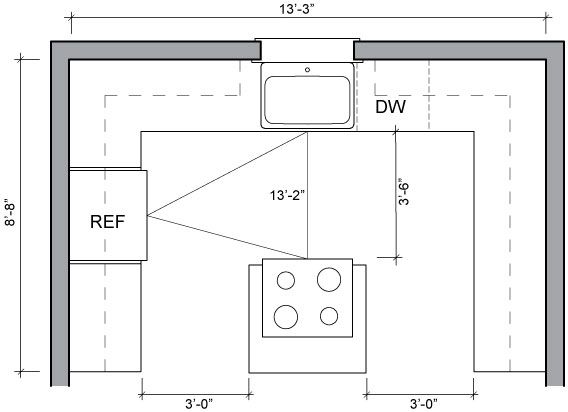 (На рисунках выше я предполагаю, что левая и нижняя части «открыты» в гостиную и/или столовую.Однако, если на вашей кухне есть шкафы с трех сторон (или стена/препятствие с третьей стороны), установить кухонный остров будет намного сложнее, потому что недостаточно места для хорошей дорожки вокруг острова. .