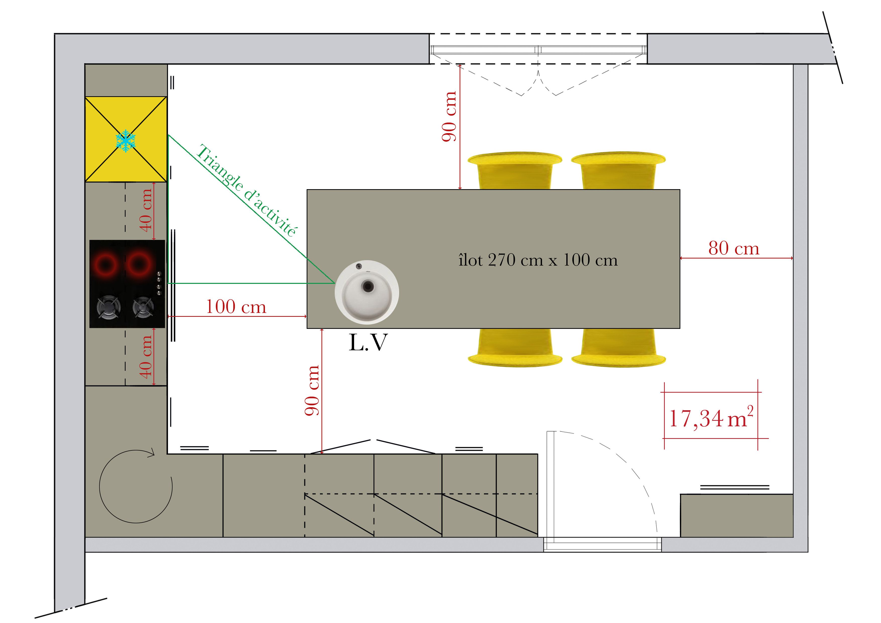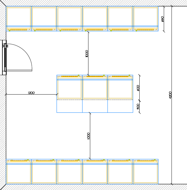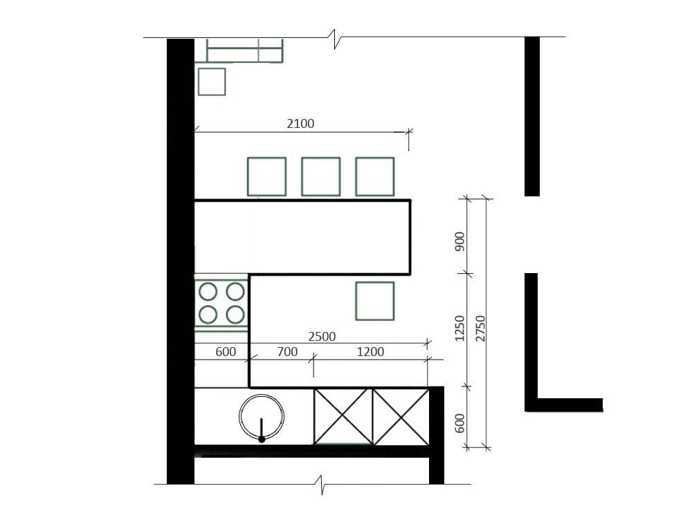 Если нет возможности увеличить остров до 90 см – то оставляю стандартную глубину просто – 60-65 см, как на плане ниже из моего проекта 2016 года, частного дома в Мос. области.