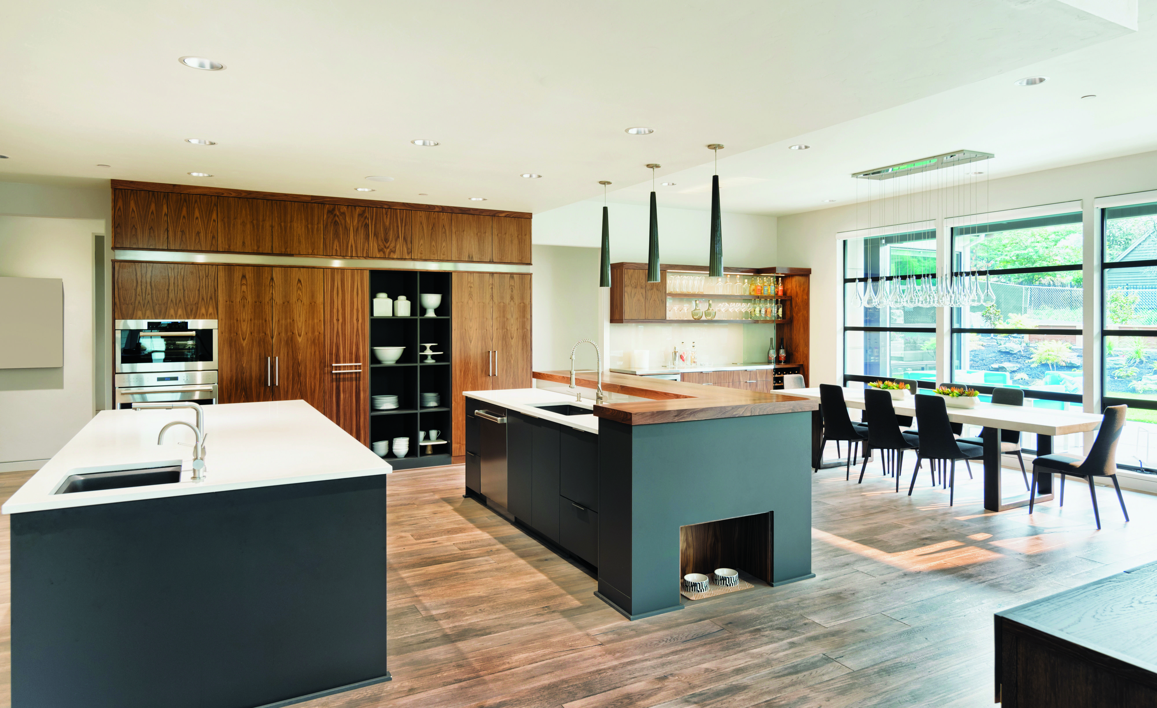 Глубина в 90 см позволяет расположить на острове одну из функциональных зон и оставить места для неформального барного стола.