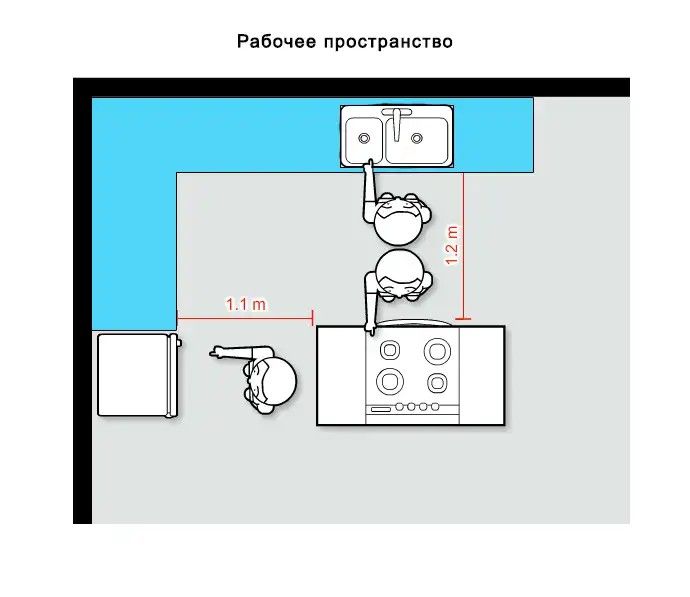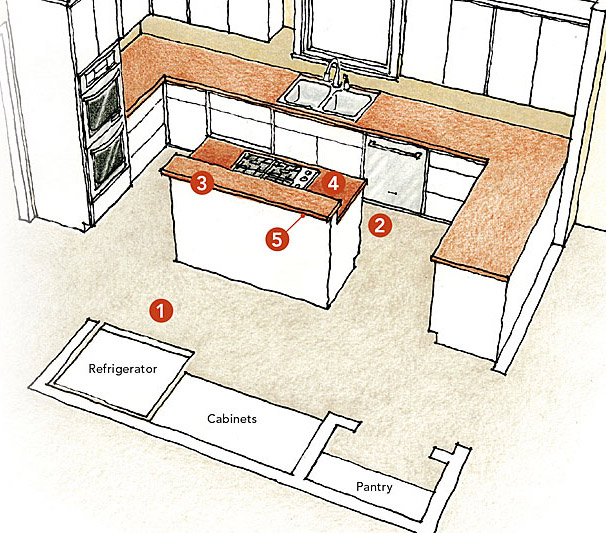 Поэтому стандартная ширина вокруг кухонного острова или любых двух параллельных прилавков или шкафов должна составлять не менее 1,20 м (4 фута) и не менее 0,9 м (3 фута), если имеется один прилавок.