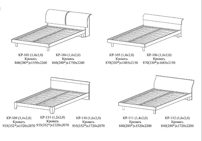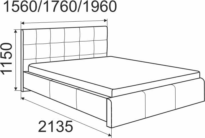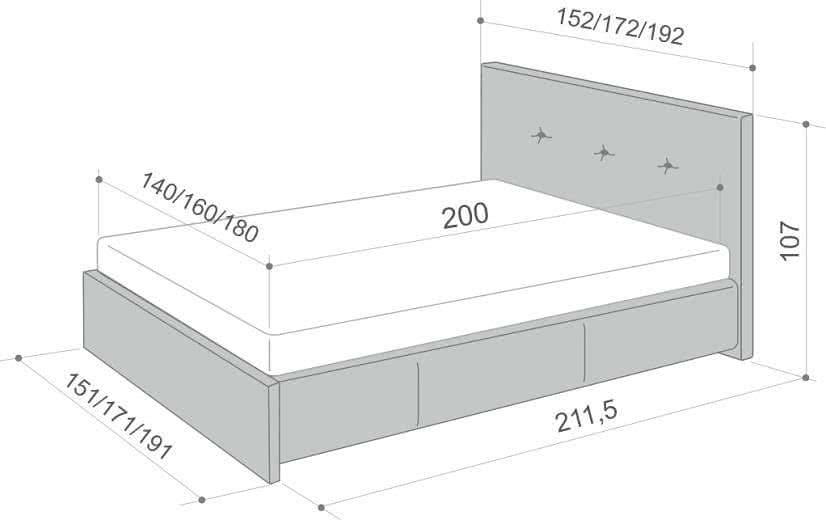 Стандартная длина спального места составляет 2000-2100 мм, изменяется только ширина. Для двуспальных конструкций она может быть 1600, 1800, 2000 мм; - Английскую сетку размеров (в дюймах и футах) используют мебельные фабрики США. Длина моделей ограничена диапазоном 190-213 см, ширина идентична европейским.