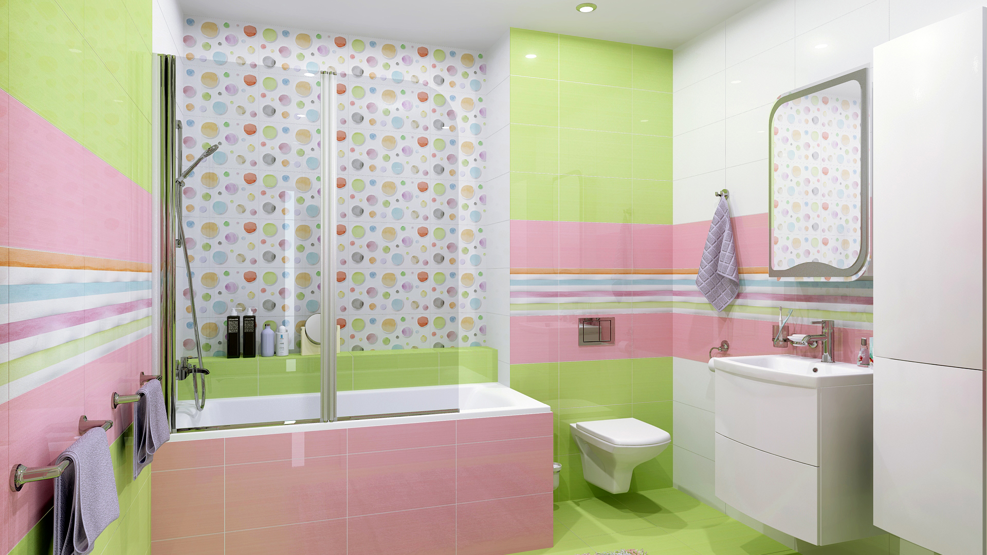современная ванная комната, облицованная с белой и разноцветной плиткой выглядит как радуга и добавляет веселья в ваш дом