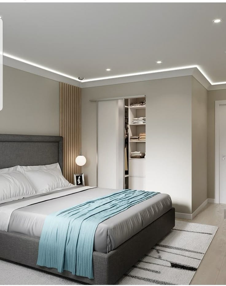 Не забывайте о потолке при перепланировке спальни. Небольшая краска над головой освежает комнату в кратчайшие сроки с небольшими финансовыми затратами.