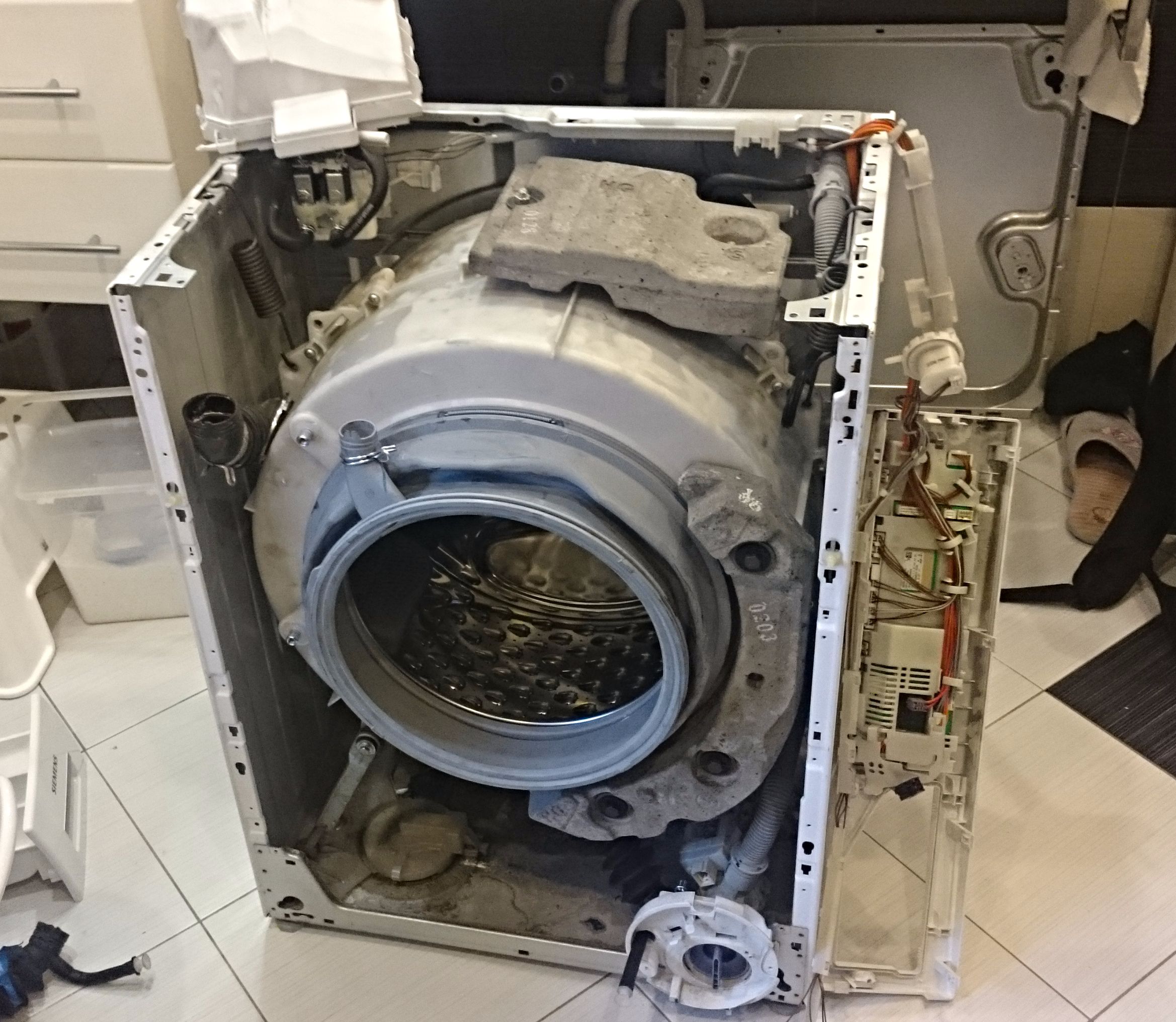 Данная процедура потребует полной разборки стиральной машины. Во время демонтажа не отсоединяйте провода от блока управления – его будет трудно подключить обратно. Демонтируйте деталь и положите ее на верхнюю раму или повесьте на специальный крюк. Как разобрать машинку? При ремонте стиральной машины Bosch, чтобы открутить барабан, нужно сначала отвинтить рессоры. Бак соединяется двумя пластиковыми защелками, которые придется сломать. Неисправные подшипники аккуратно выбивают из гнезда при помощи молотка и долота, зачищают место посадки и затем устанавливают новые детали.
