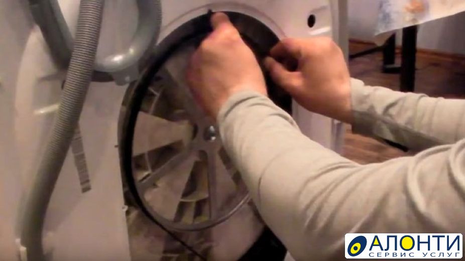 Чтобы убрать внутренний хомут, следует осуществить демонтаж передней панели либо ослабление винта хомута через верхнюю крышку. Теперь можно осторожно снять резину. Установка новой будет производиться в обратной последовательности.