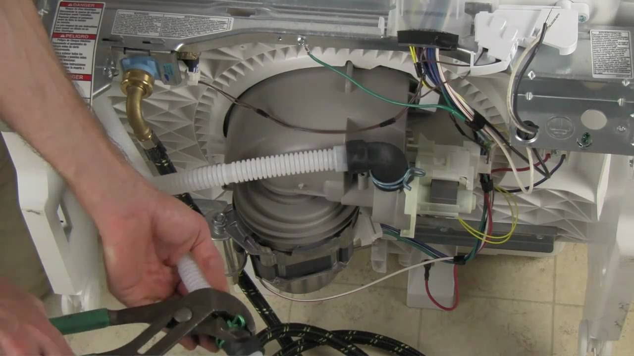 Если она забит мусором, то прочищаем его. Если все было сделано, но слив лучше не стал, то следует обратить внимание на насос и патрубок. Для этого кладем корпус машины набок, после чего достаем дозатор для порошка и разжимаем хомут патрубка.Его следует демонтировать, прочистить от засоров и промыть теплой водой. Теперь следует проверить помпу – если она неисправна, то проводится замена. Для этого следует отсоединить проводку от насосных контактов и выкрутить болты, что удерживают насос.