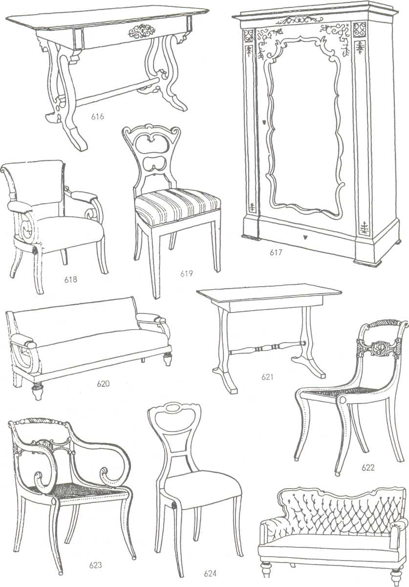 Деревянные части украшались фарфоровыми вставками или бронзой. Обращают внимание новые по тому времени модели мебели с различного рода функциональными нововведениями и дополнительными элементами. На иллюстрации показан «сложный диван», в котором совмещены кушетка и два кресла. Подобного рода предметы меблировки встречаются в ряде воспроизводимых нами интерьеров.
