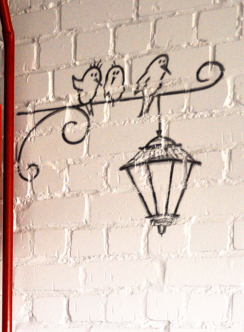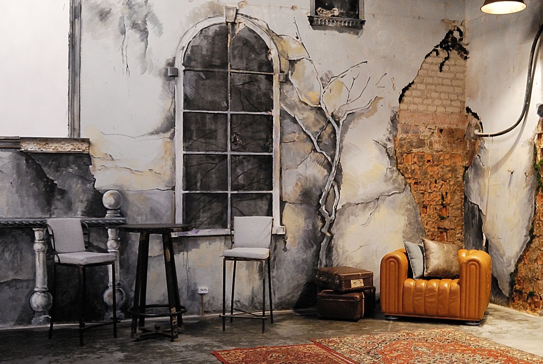 На стене можно сделать и роспись. Рисунки могут быть причудливыми или отражать исторические события (но показывать их нужно с иронической стороны), например, поцелуй Брежнева. На стене нередко делают надписи: цитаты, слоганы, разные девизы. 3D фотообои в стиле лофт помогают сэкономить на натуральных материалах, при этом они создают требуемую обстановку.