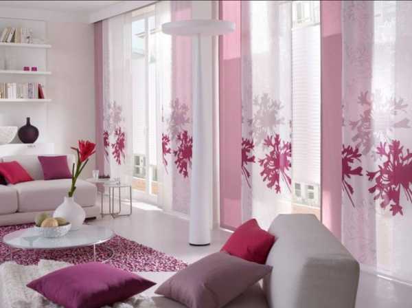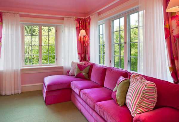Использование розовых занавесок при декорировании гостиной