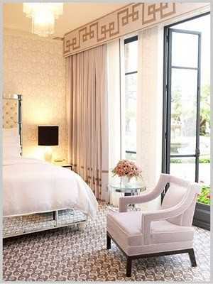 Для интерьера в стиле классического модерна лучше выбрать двойные портьеры с необычными геометрическими узорами светлых оттенков розового.