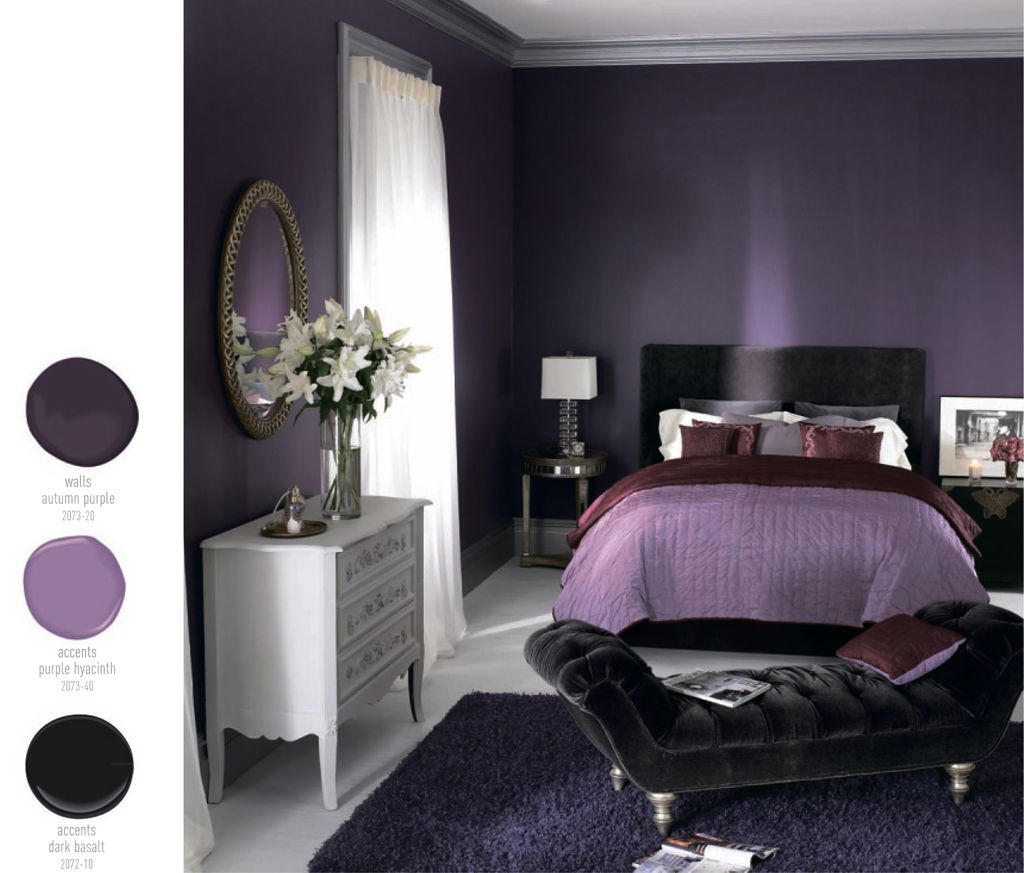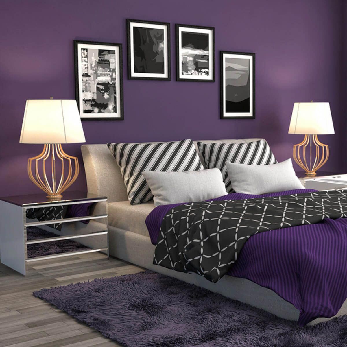 Если вы хотите чего-то более пышного и утонченного, используйте фиолетовый цвет баклажана для стен в сочетании с глянцевой белой отделкой. Пурпурный в сочетании с мягким синим или зеленым цветом создает очень спокойную цветовую гамму.