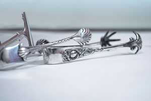 Еще одну большую группу вспомогательных столовых приборов составляют щипцы. Большие кондитерские щипцы предназначены для перекладывания выпечки. Малые — для сахара, шоколадных конфет без обертки, мармелада, зефира. Если в меню значатся коктейли, невозможно обойтись без щипцов для перекладывания льда. Этот прибор U-образный, с лопатками на концах. Особые щипцы (V-образной формы) — существуют для колки орехов.