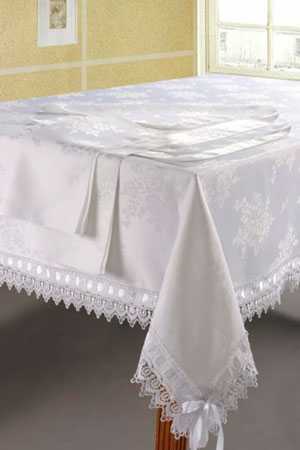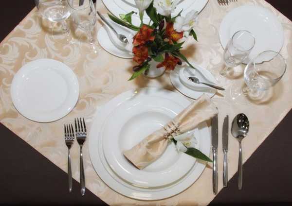 Скатерть — это фон, который оттеняет блеск столовых приборов и хрусталя, изящество и красоту посуды. Думаем, излишне говорить о том, что скатерть должна быть ослепительно чистой и великолепно отглаженной. В классическом варианте скатерть должна быть белой, однако сегодня доступно много различных вариантов. Главное — чтобы по стилю и цвету она сочеталась со столовыми приборами и салфетками. Также важно, чтобы накрытый стол вписывался в помещение, в котором будет проходить торжество. Как видите, от выбора скатерти зависит очень и очень многое.