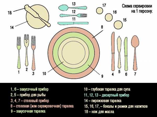 Количество и расположение посуды, столовых принадлежностей и бокалов зависит от вида трапезы — завтрак, обед, ужин, торжественный приём гостей. В самом сложном случае расположение приборов показано на рисунке ниже: