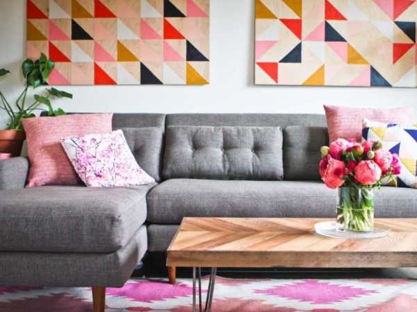 Что касается дополнительных цветов, гармонично сочетающихся с серым диванов, то самые лучшие контрастные оттенки – это оранжевый, розовый и жёлтый. Также хорошо сочетается с серым коралловый (лососевый), который можно рассматривать смешением оранжевого и розового.