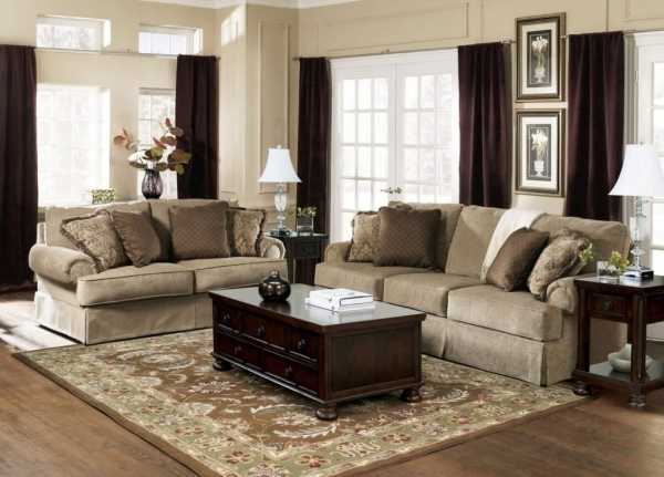 Для приверженцев европейской классики интересным станет объединение в одну группу пепельного дивана спокойной формы и фиолетового, либо изумрудного кресел с высокими стегаными спинками, изогнутыми подлокотниками, «ушастым» изголовьем. Наиболее выигрышно эти цвета подают ткани с бархатистым эффектом.