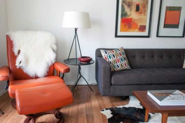 Современный интерьерный дизайн предлагает смелые цветовые сочетания предметов мягкой мебели: кресла, совпадающие по тону с диваном, кажутся устаревшими. На смену однообразию, характерному для традиционных стилей, приходит контраст. Особенно жизнерадостно рядом с темно-серым диваном выглядят желтые, оранжевые мягкие сиденья, популярен цвет «красный апельсин». Подбираются модели простых форм с подлокотниками, перетекающими в спинку.