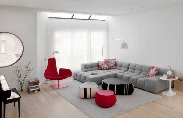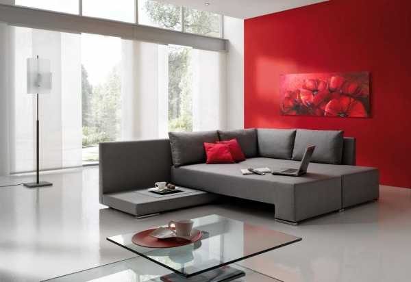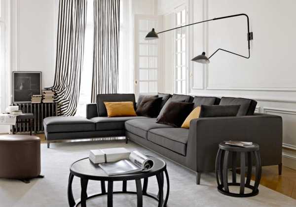 Гамма серого чрезвычайно обширна: от оттенка небеленого холста до темного цвета мокрого асфальта, почти черного. Его промежуточные вариации – добавление к основному цвету других красок спектра – предлагает на выбор бесчисленное множество комбинаций. Здесь важно сделать упор на правильность сочетания: смешивание серого с теплыми тонами зачастую дает эффект «грязного» цвета. В этом случае предпочтительнее использовать цвета по отдельности: серый сделать основным фоном дивана, а желтый, красный, горчичный использовать для декоративных элементов (подушек, приставных пуфов, накладных подлокотников).