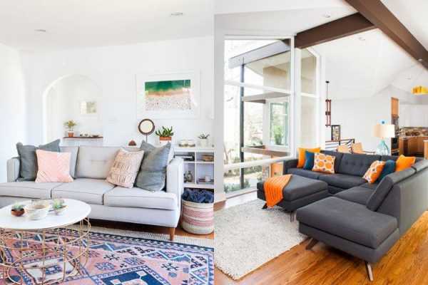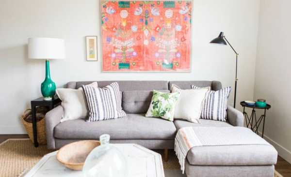 Наделенный функцией единственного цветового акцента, массивный серый диван, бросающийся в глаза, как только вы открываете дверь – это темно и неинтересно. Расцветите его подушками, украсьте комнату шторами или ковром с подходящим принтом – интерьер заиграет яркими красками.