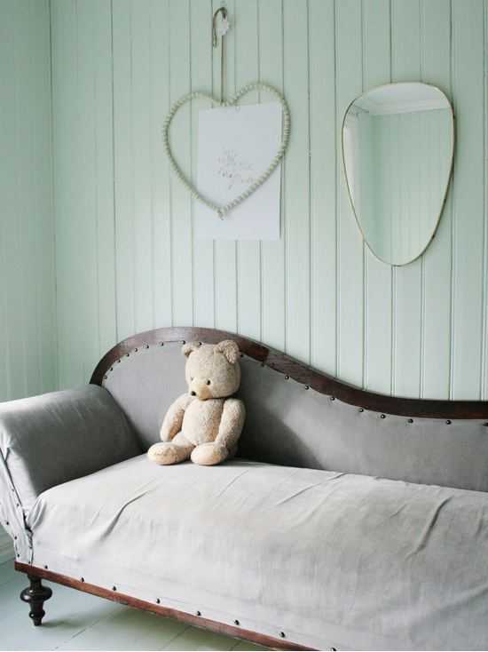 Резные деревянные детали, серый фактурный гобелен или плотный холст обивки, прикрепленные к спинке ажурные вязаные салфетки ручной работы – подобный диванчик способен украсить романтическую спальню или комнату в стиле шебби-шик.
