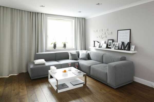 Но не стоит отвлекаться от темы мебели. Обычный угловой или прямой диван серого цвета в интерьере может теряться и казаться скучным. Всё потому, что его нейтральность нужно обязательно разбавить и красиво подать. А помочь в этом могут: приятный бархатный ворс, плетение нитей и подчёркнутость швов. Кроме того, можно всегда использовать комбинацию разных оттенков серого. К примеру, дизайн гостиной с серым диваном может иметь следующие цвета: