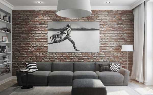 Молодёжная гостиная, интерьер студии или просторной гостиной в стиле лофт с кирпичной стеной также примут серый диван любого тона.