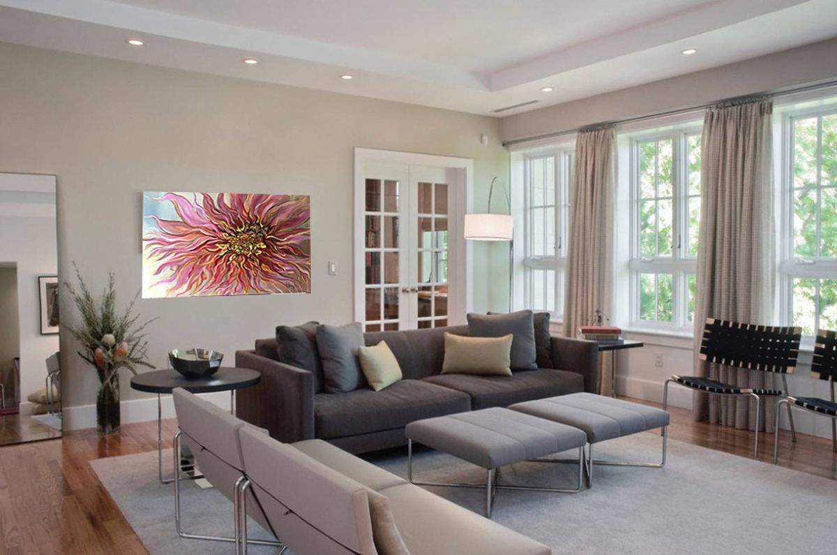 Придвинув кушетку к стене, вы можете легко создать баланс в комнате. Огромный L-образный диван сидит достаточно низко, чтобы стена галереи выглядела заметной.