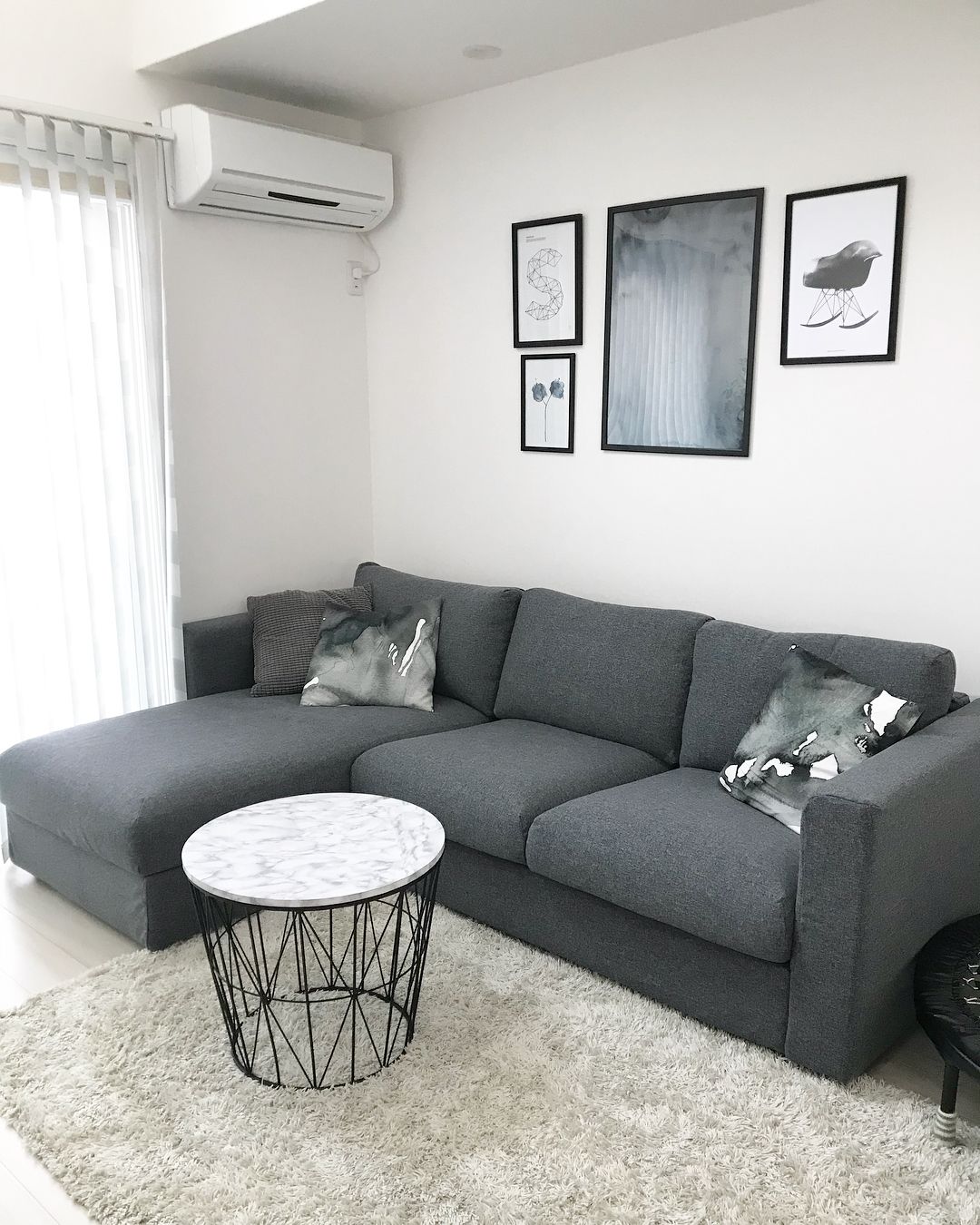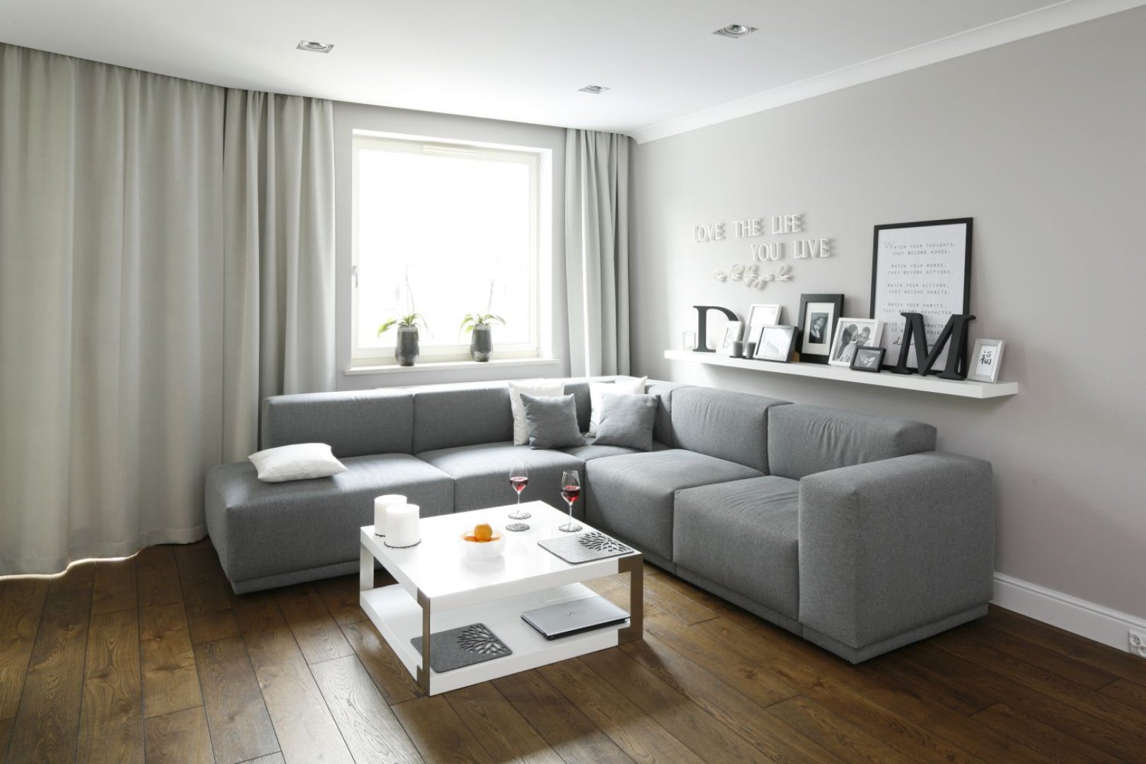 Сделайте дизайн гостиной достаточно простым. При этом уделяется должное внимание каждому предмету мебели, размещенному в комнате. Стильный серый диван L-образной формы простой, но очаровательный.