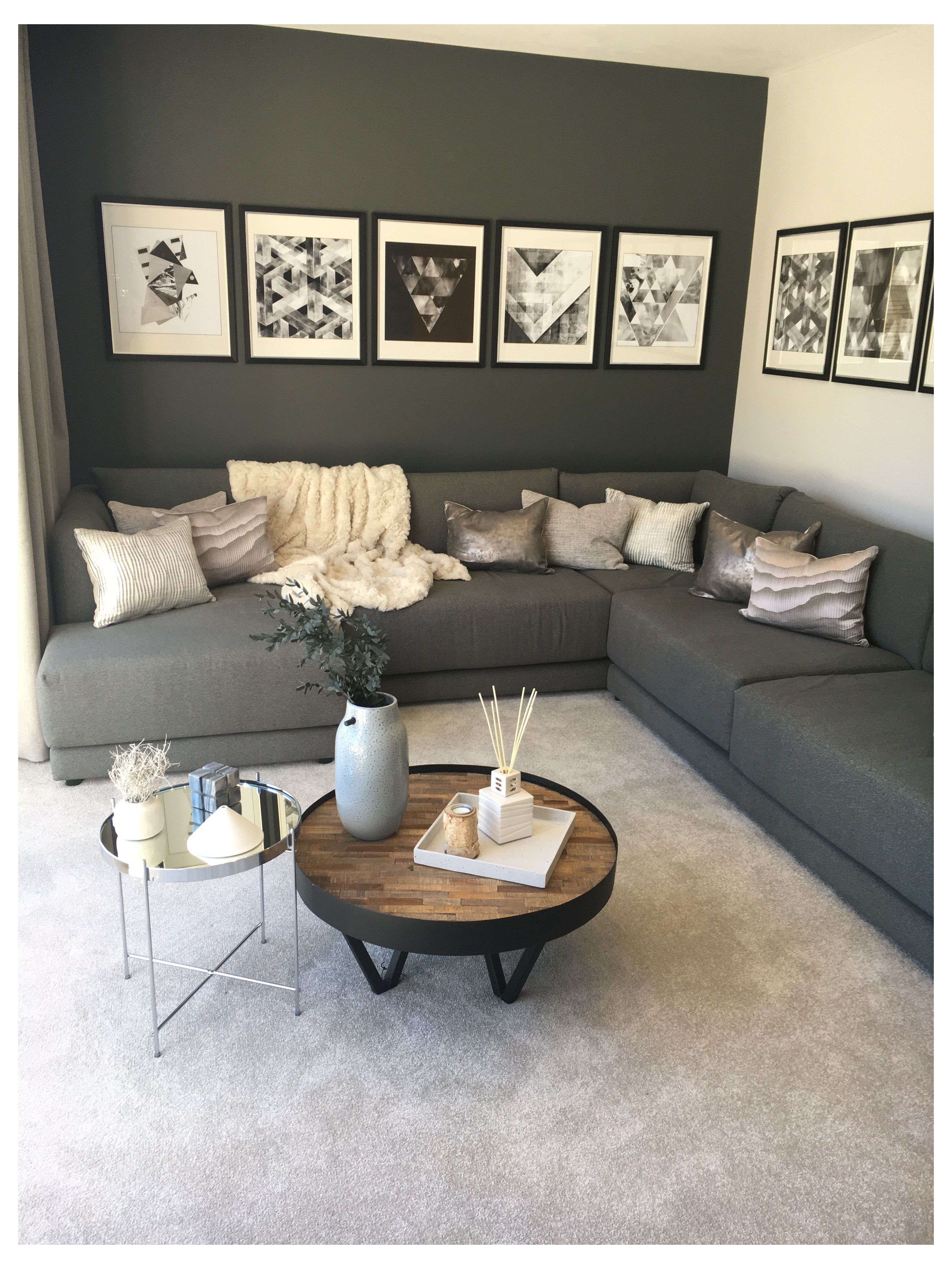 Сланцево-серые стены вневременные, но стильные. Этот оттенок украшает комнату и позволяет большому серому дивану привлекать внимание.